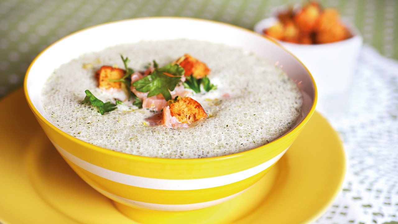 Broccolisuppe med røget laks, citron-croutoner og Nutridrink